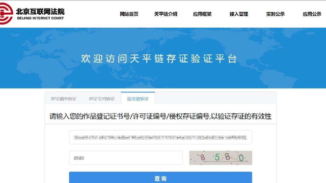 北京互聯網法院在2022年中國國際服務貿易交易會上展出了北京互聯網法院與北京版權保護中心共同搭建的“版權鏈-天平鏈協同治理平臺”2.0版本。截至2022年11月14日16時,天平鏈已經吸引了來自技術服務、應用服務、知識產權、金融交易等9類23家應用單位的接入,一級節點數量為14個,二級節點為9個,在線采集數據數為169720004個,在線證據驗證數為30601個。