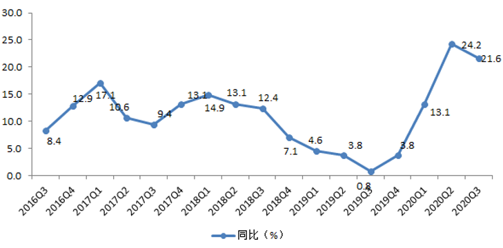 圖1:2016-2020年各季度全國網絡零售滲透指數同比走勢圖